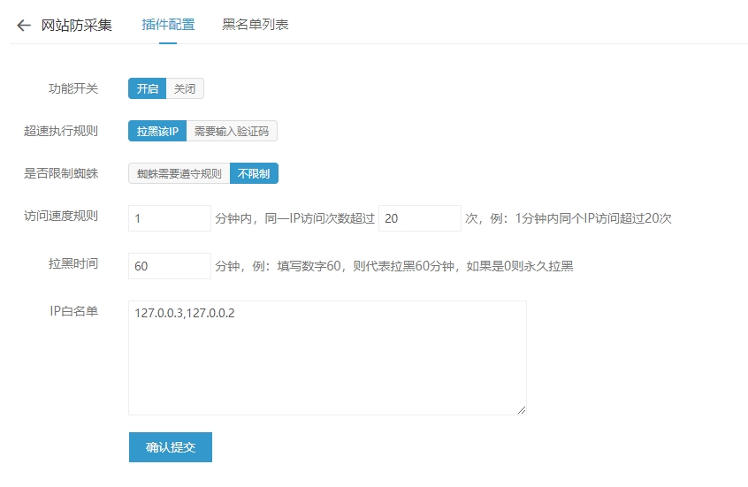 访问速度规则:可设置N分钟内访问页面N次,例如:1分钟内访问页面20次,超出次数显示验证码或者临时拉黑、永久拉黑等;